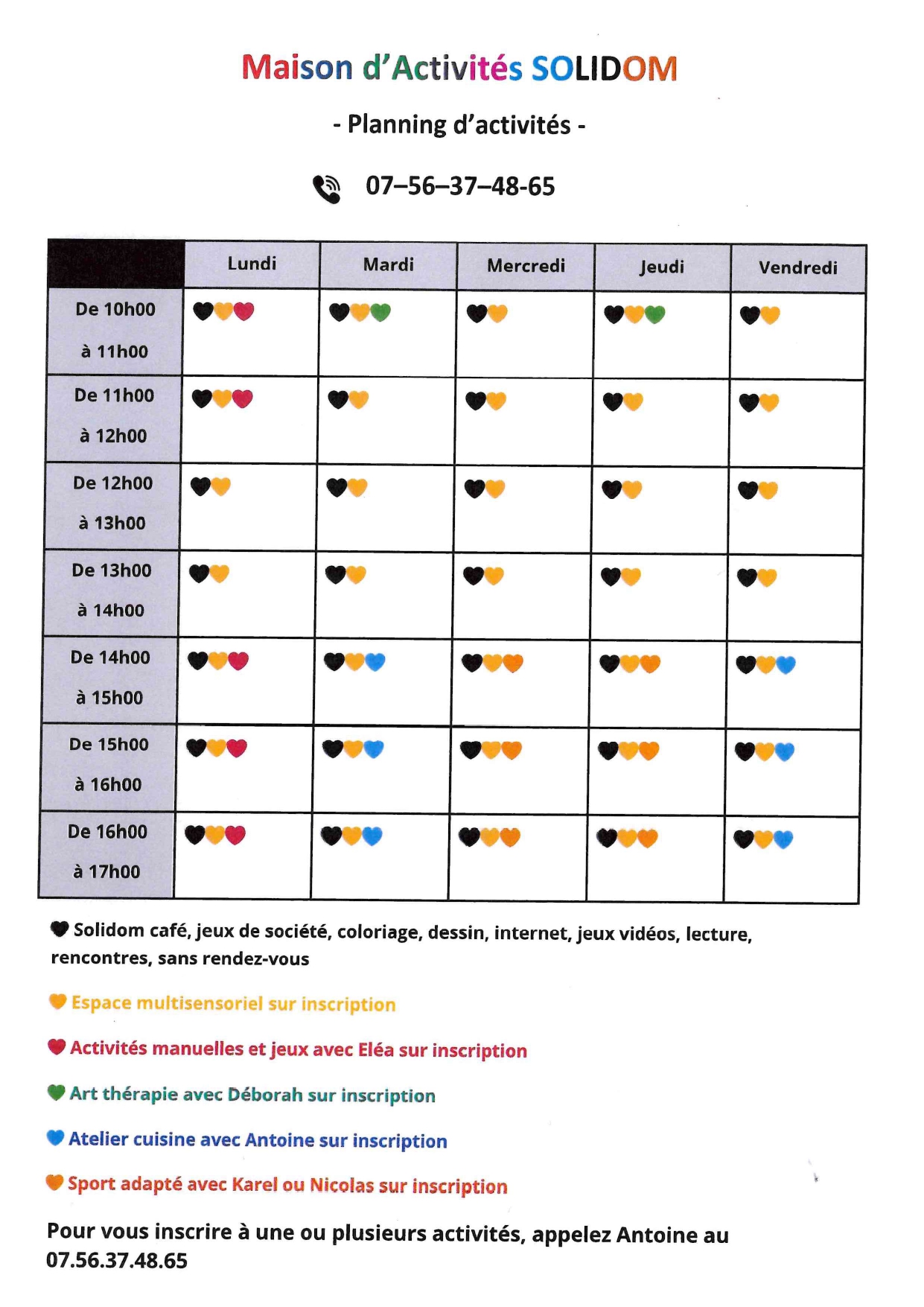 La Maison est dédiée aux bénéficiaires de l'Association. Les activités sont GRATUITES pour les bénéficiaires SOLIDOM. Un professionnel est dédié à l'animation de la Maison d'Activités. Vous pouvez venir accompagné(e) de votre auxiliaire de vie ou tout seul si vous êtes autonome. Les activités sont adaptées à l'autonomie de chacun et encadrées par des professionnels diplômés.