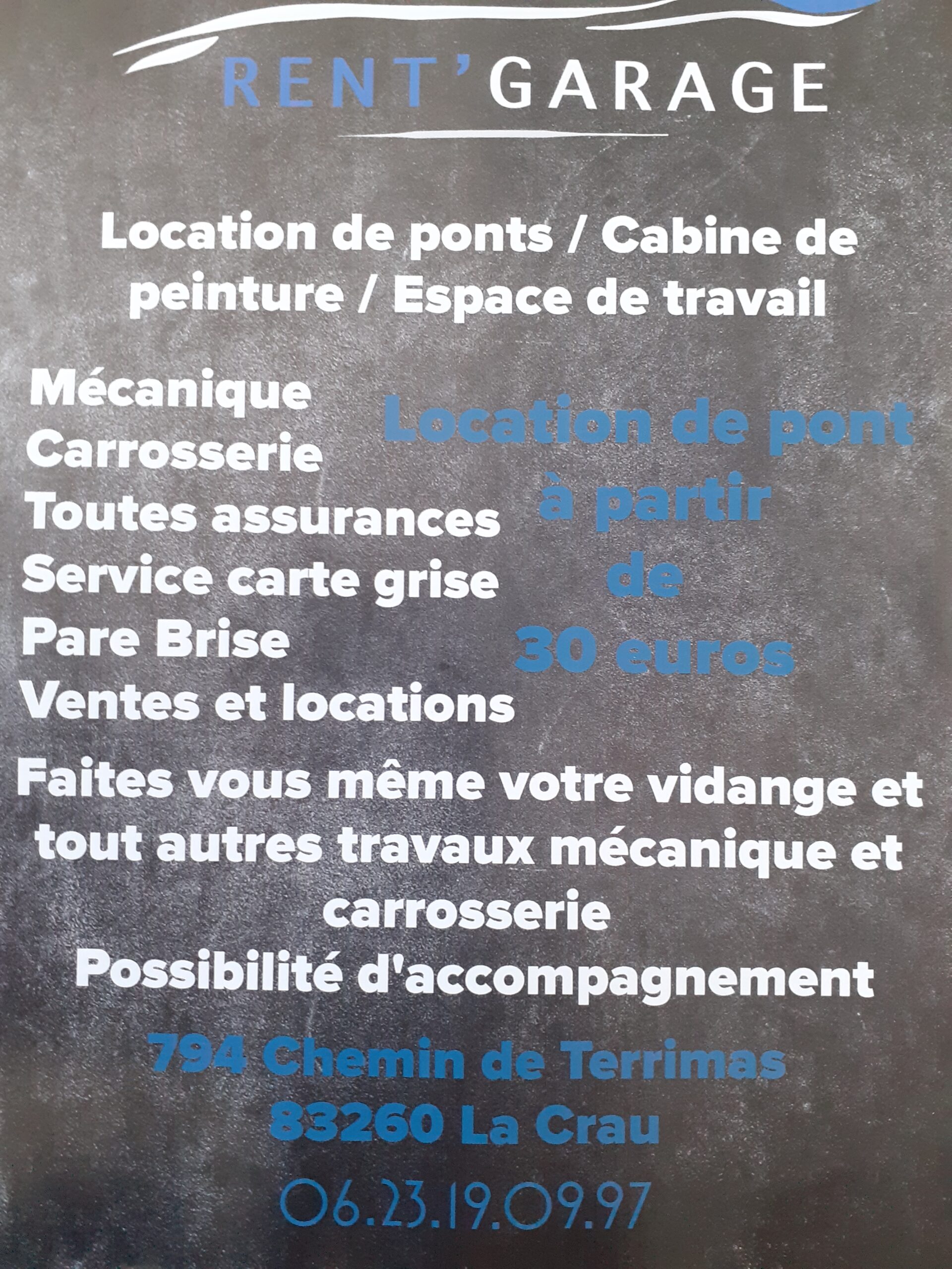 A ce jour, nous avons un garage référent. Il s’agit du garage RENT’GARAGE situé sur LA CRAU. Celui-ci est en mesure d’intervenir sur la partie mécanique, sur la partie carrosserie et en cas de bris de glaces.